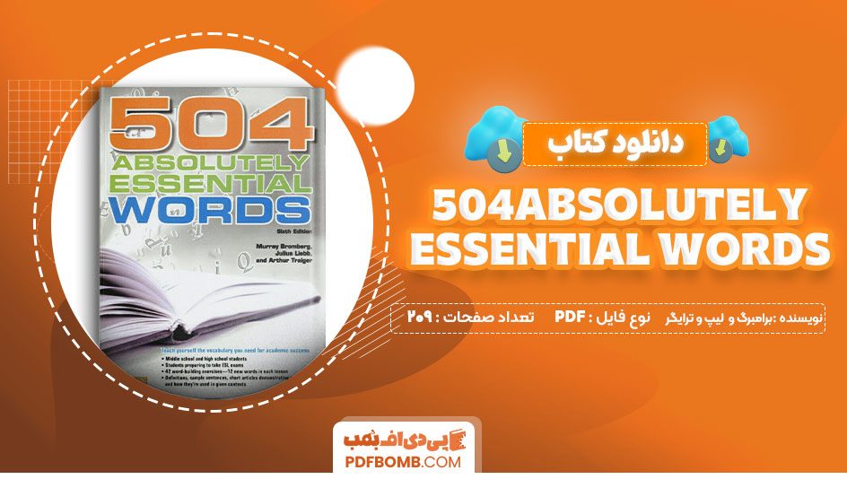 دانلود کتاب 504Absolutely essential words موری برامبرگ و جولیوس لیب و آرتور ترایگر 209 صفحه PDF پی دی اف📙 در سایت پی دی اف بمب در اختیار شما قرار گرفت. کتاب “504 Absolutely Essential Words” (پنجمصد و چهار واژه ضروری) یکی از منابع محبوب و پراستفاده برای یادگیری واژگان زبان انگلیسی است که توسط موری برامبرگ (Murray Bromberg)، جولیوس لیب (Julius Liebb)، و آرتور ترایگر (Arthur Traiger) نوشته شده است. این کتاب در سطح جهانی به عنوان یک منبع استاندارد برای تقویت دایره واژگان به ویژه برای زبانآموزان سطوح متوسط و پیشرفته و همچنین برای آمادگی آزمونهای استاندارد مانند TOEFL، IELTS، GRE و SAT شناخته میشود.با سایت پی دی اف بمب در این مطلب همراه باشید.